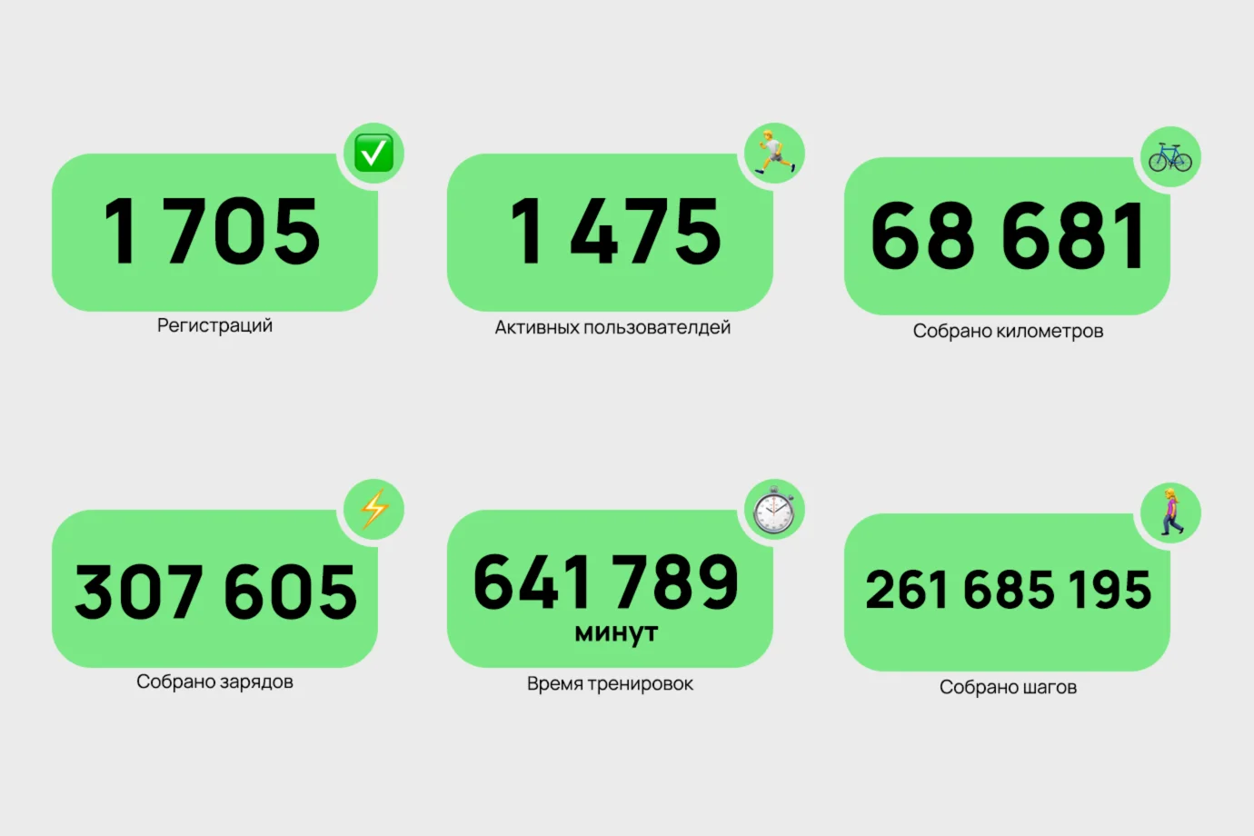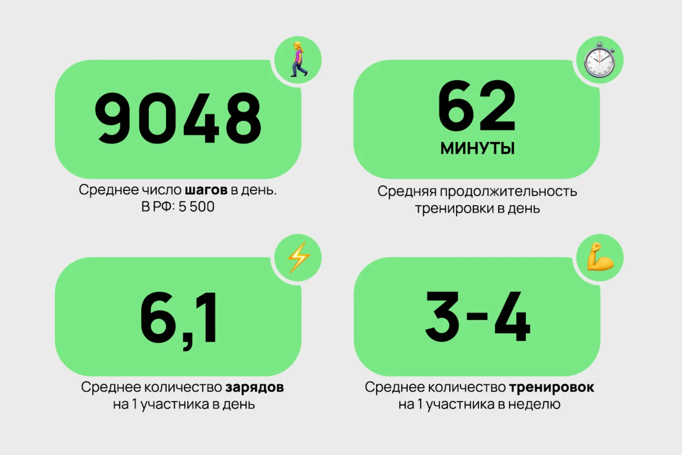 Одна из самых популярных активностей на платформе — пешая ходьба. Простой и доступный вид физической активности мотивировал сотрудников двигаться больше — выбраться в парк, сходить в гости к друзьям или в магазин вместо заказа продуктов на дом. Благодаря этому в среднем каждый участник нашего проекта совершал 9000 шагов в день. 874 человека приняли участие и успешно прошли личные челленджи.