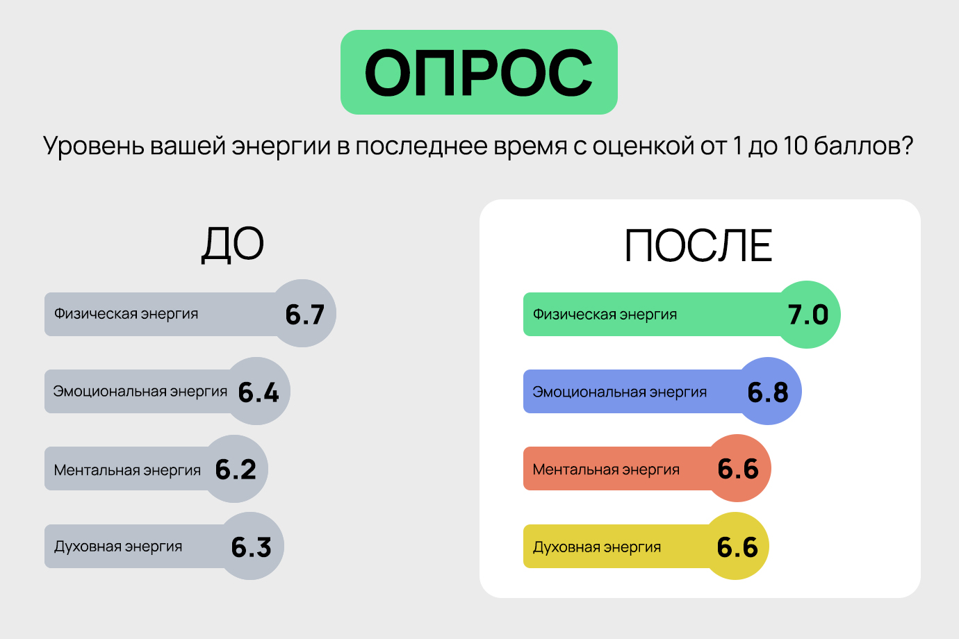 Опросы. Мы отслеживаем не только количественные параметры, но и качественные, благодаря опросам участников проекта. Так сотрудники Яндекса оценили удовлетворенность жизнью до и после челленджа с помощью Лестницы Кантрила и оценки уровня энергии.
