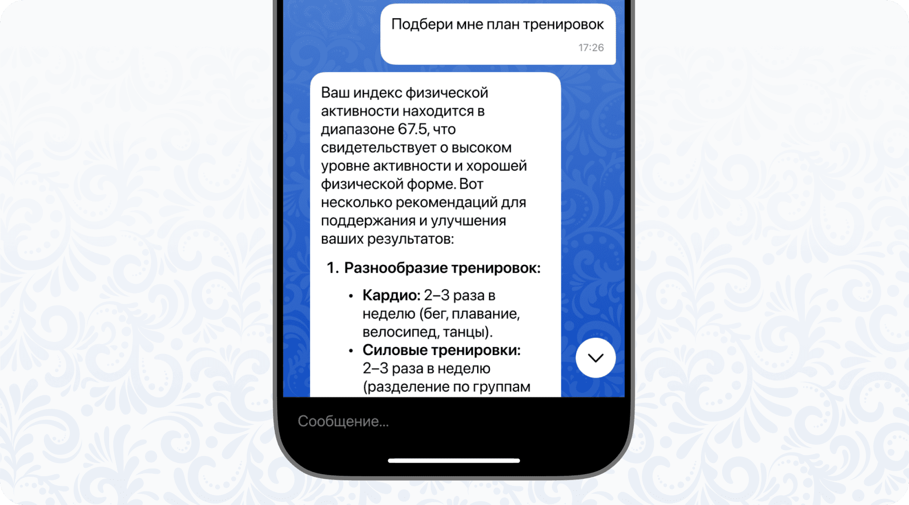 Добрыня анализирует Индекс здоровья и дает персонализированные рекомендации и ответы на вопросы по питанию, плану тренировок, эмоциональному состоянию и сну.