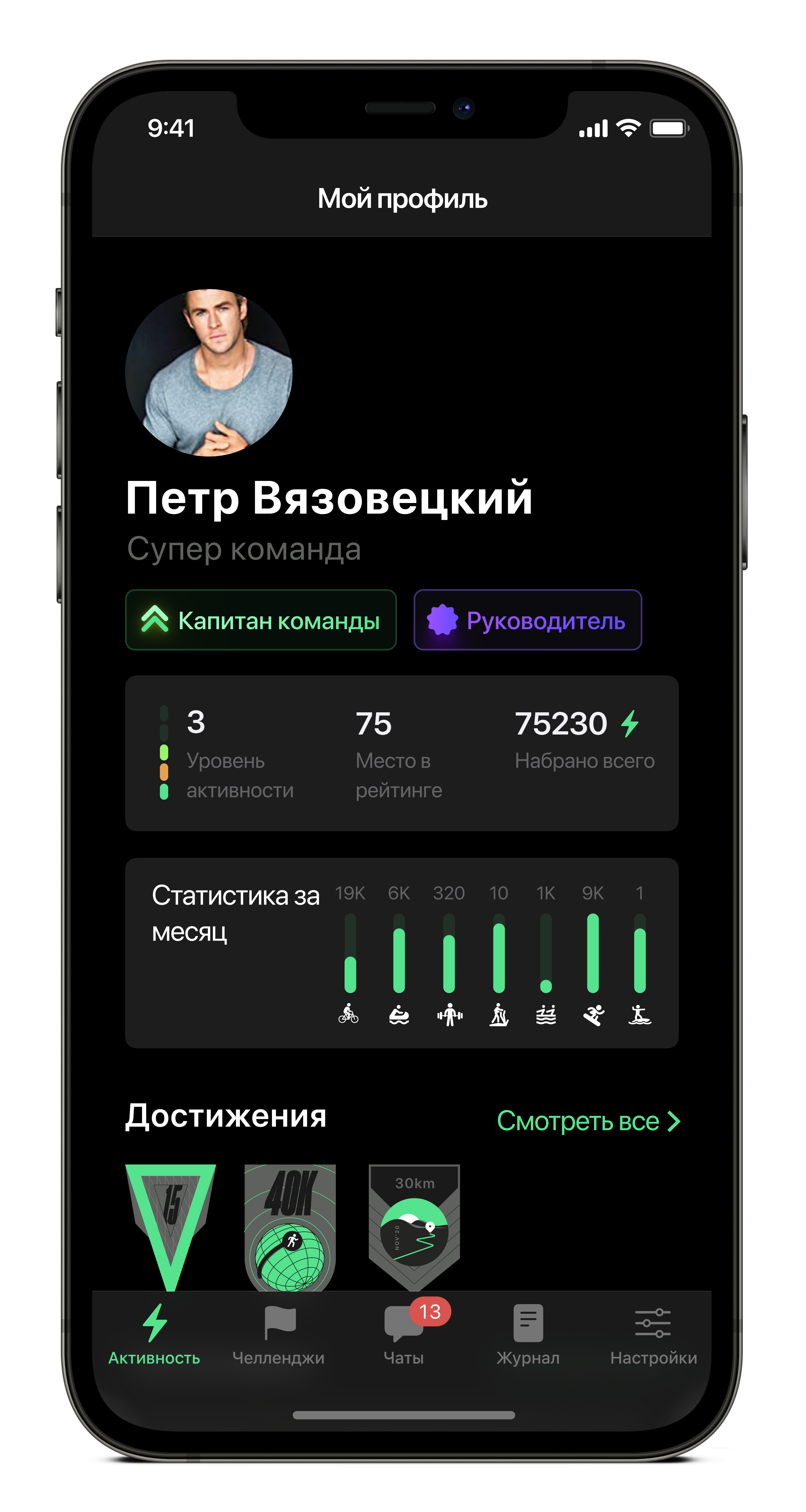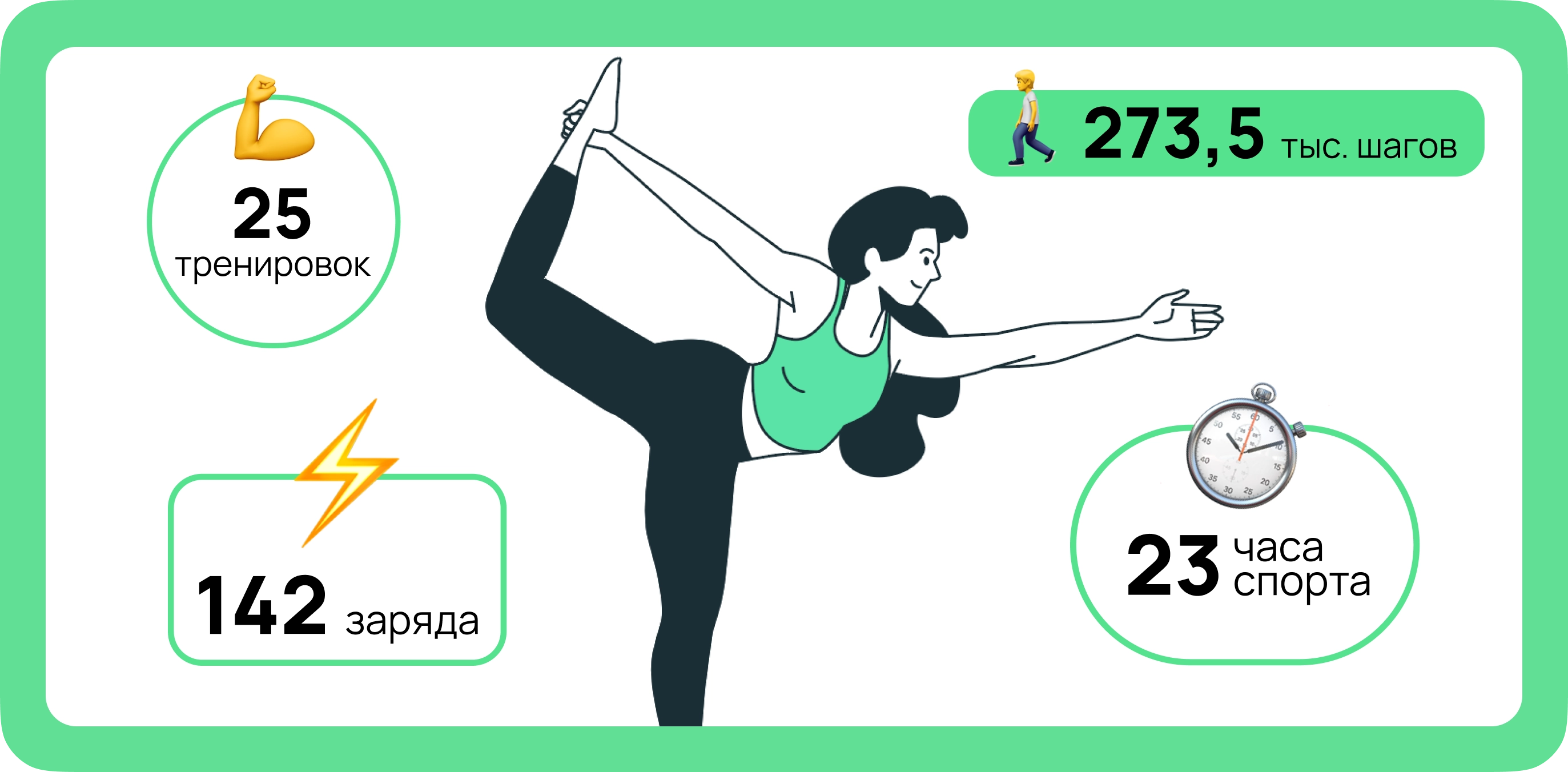 Мы также составили средний портрет пользователя: примерно 270 000 шагов, 142 заряда активности, 23 часа тренировок и около 25 сессий занятий спортом.