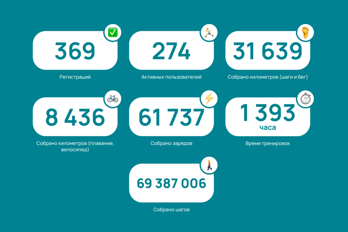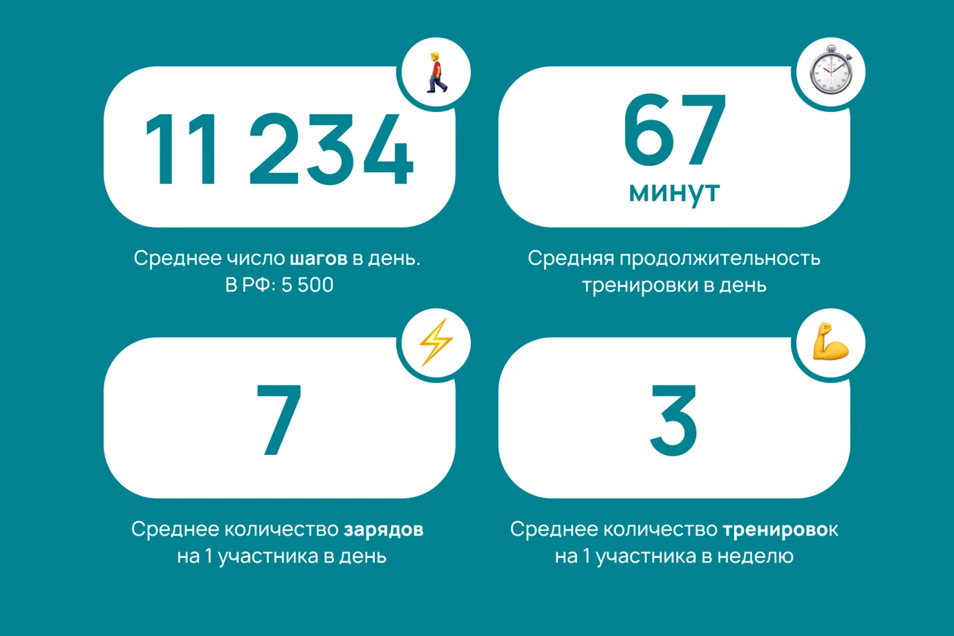 В среднем пользователи заходили в приложение 3 раза в день и приняли участие в опросах до и после соревнований. Так сотрудники отметили, что уровень физической энергии увеличился на 6 единиц (с 6,4 до 7 баллов), уровень эмоциональной энергии — на 9 единиц (с 6,3 до 7,2 баллов). Всё это говорит о комплексном улучшении самочувствия спустя месяц.