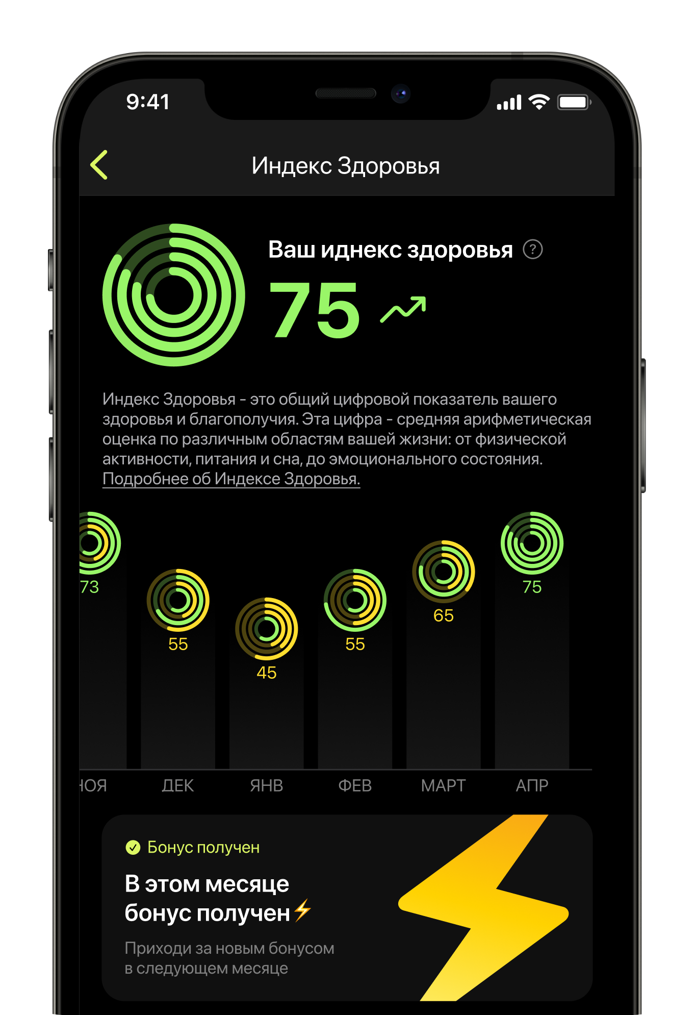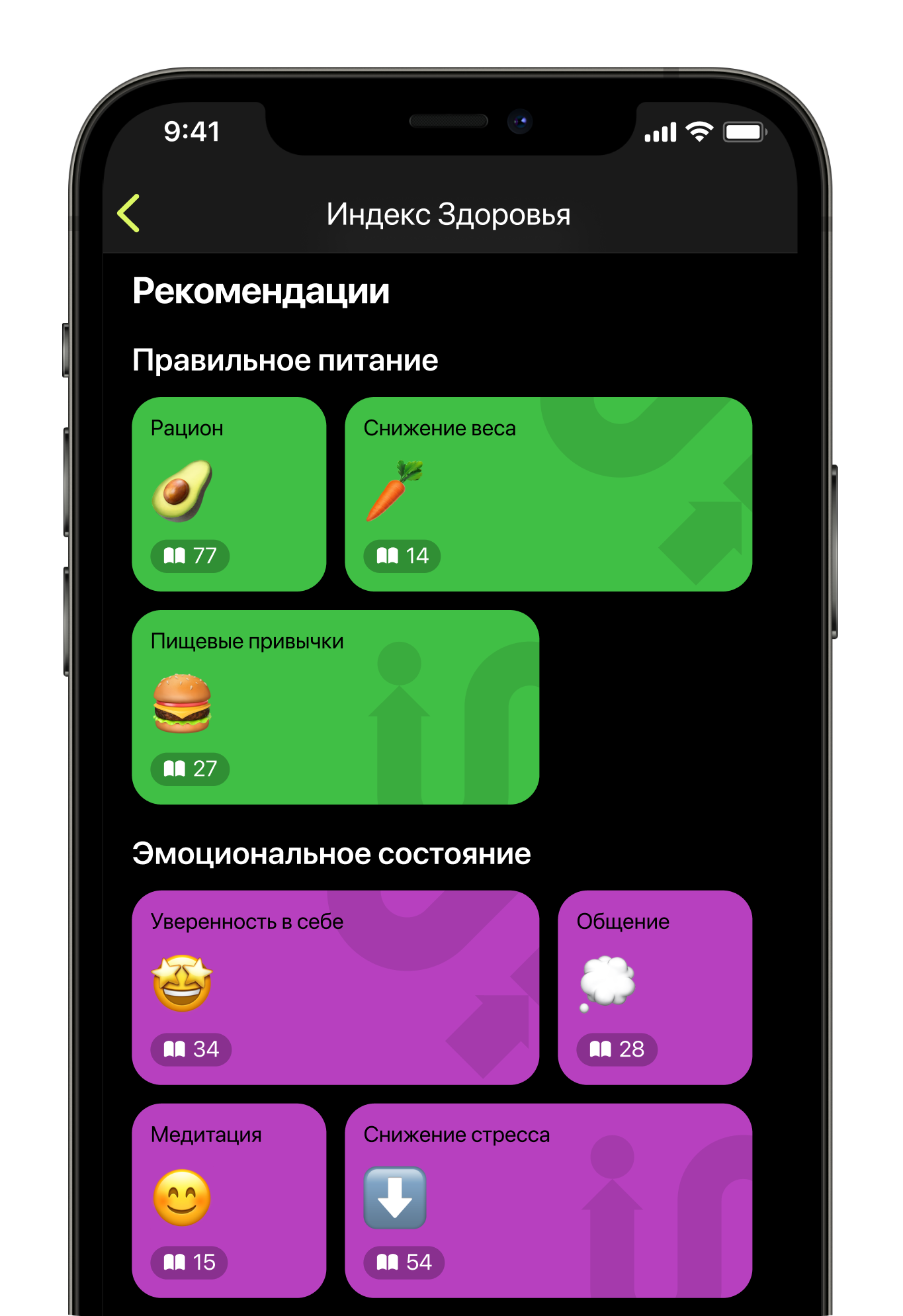 Наша методика легла в основу инструмента «Индекс Здоровья», с помощью которого можно отслеживать изменения в самочувствии до и после мероприятий в приложении.