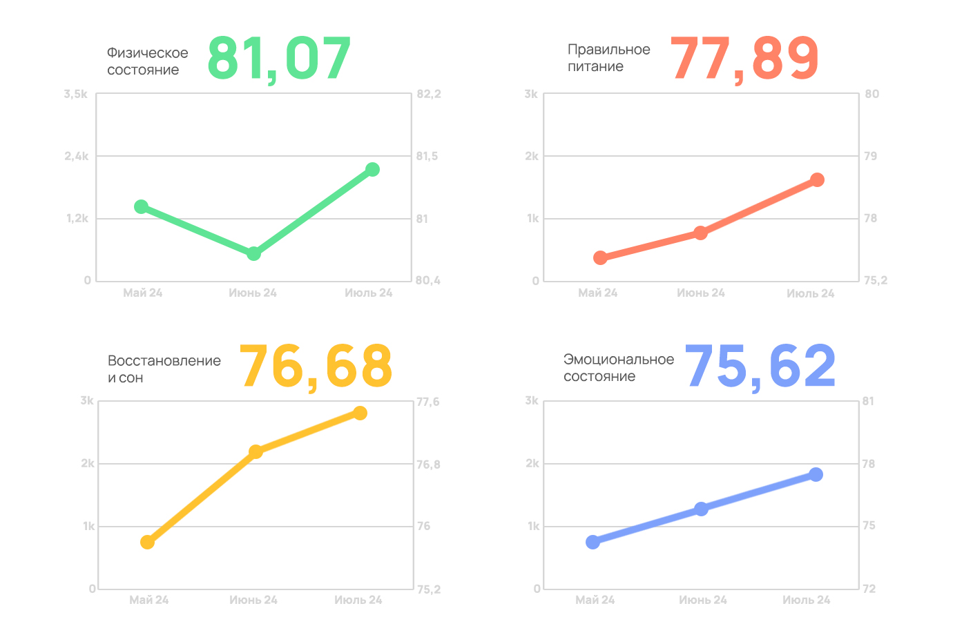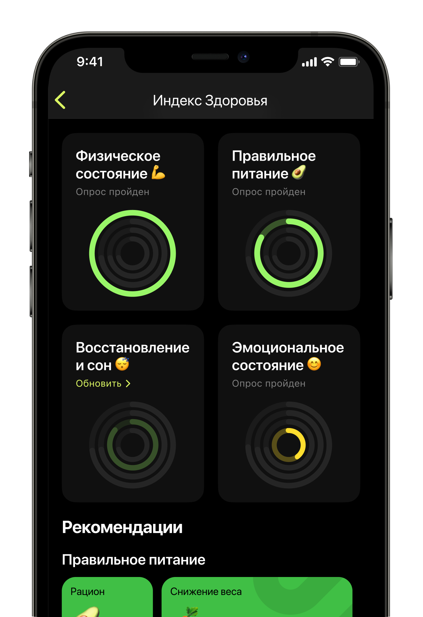 Вместе с консультантами, врачами и кандидатами медицинских наук мы разработали уникальную методологию, которая позволяет посмотреть на состояние человека комплексно: проанализировать физическое и эмоциональное состояние, качество питания, сна и восстановления.