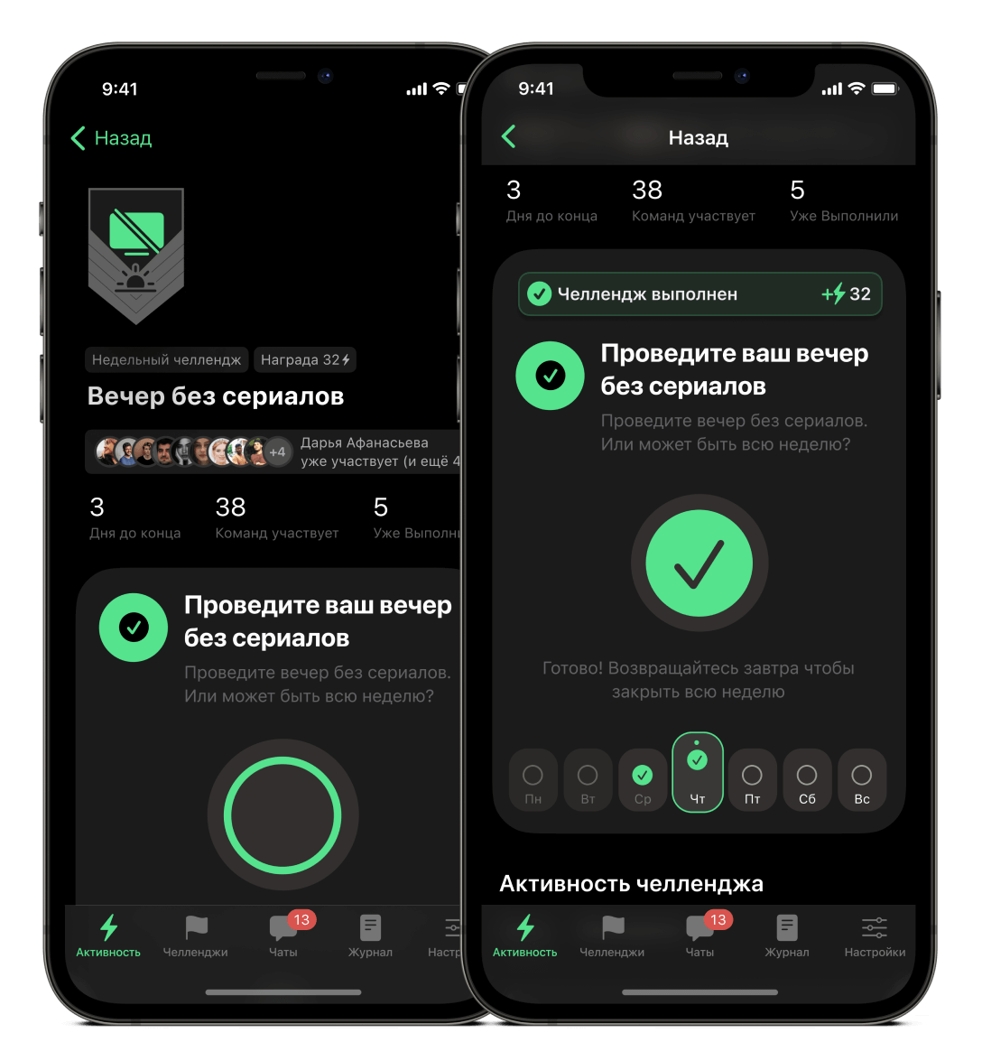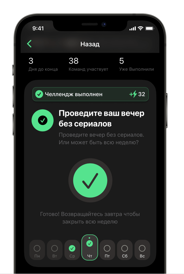 Для этого нам нужно в течение недели это контролировать, проставлять галочки, получать бонусные заряды и выполнять в приложении тренировки дня — активность с самым большим количеством зарядов.