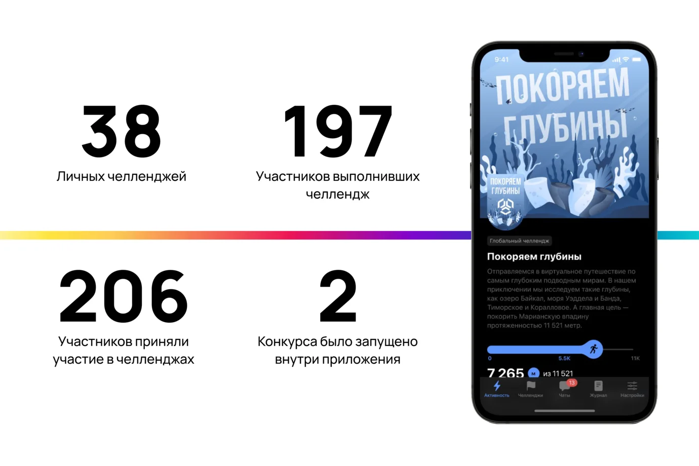 Команда заказчика большая и распределенная, поэтому одной из главных целей проекта было ее объединение. Офлайн сделать это практически невозможно, а онлайн — отлично справляется с задачей. Кроме того, нам необходимо было вовлечь большое количество участников и стимулировать их к увеличению физической активности. Для этого идеально подходит формат «Глобальный челлендж».