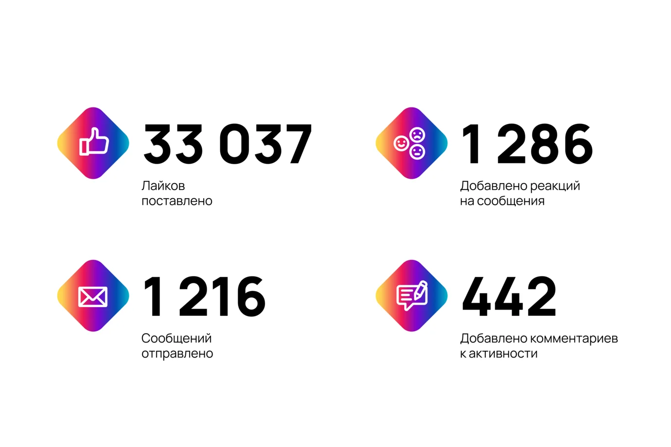Сотрудники общались друг с другом в чатах, комментировали активности друг друга, ставили реакции на посты. Это создавало дружескую атмосферу, помогало участникам узнать друг друга и мотивировало быть активнее. Наша команда модерировала чаты, чтобы общение было доброжелательным и уважительным, а вся информация о тренировках — достоверной.