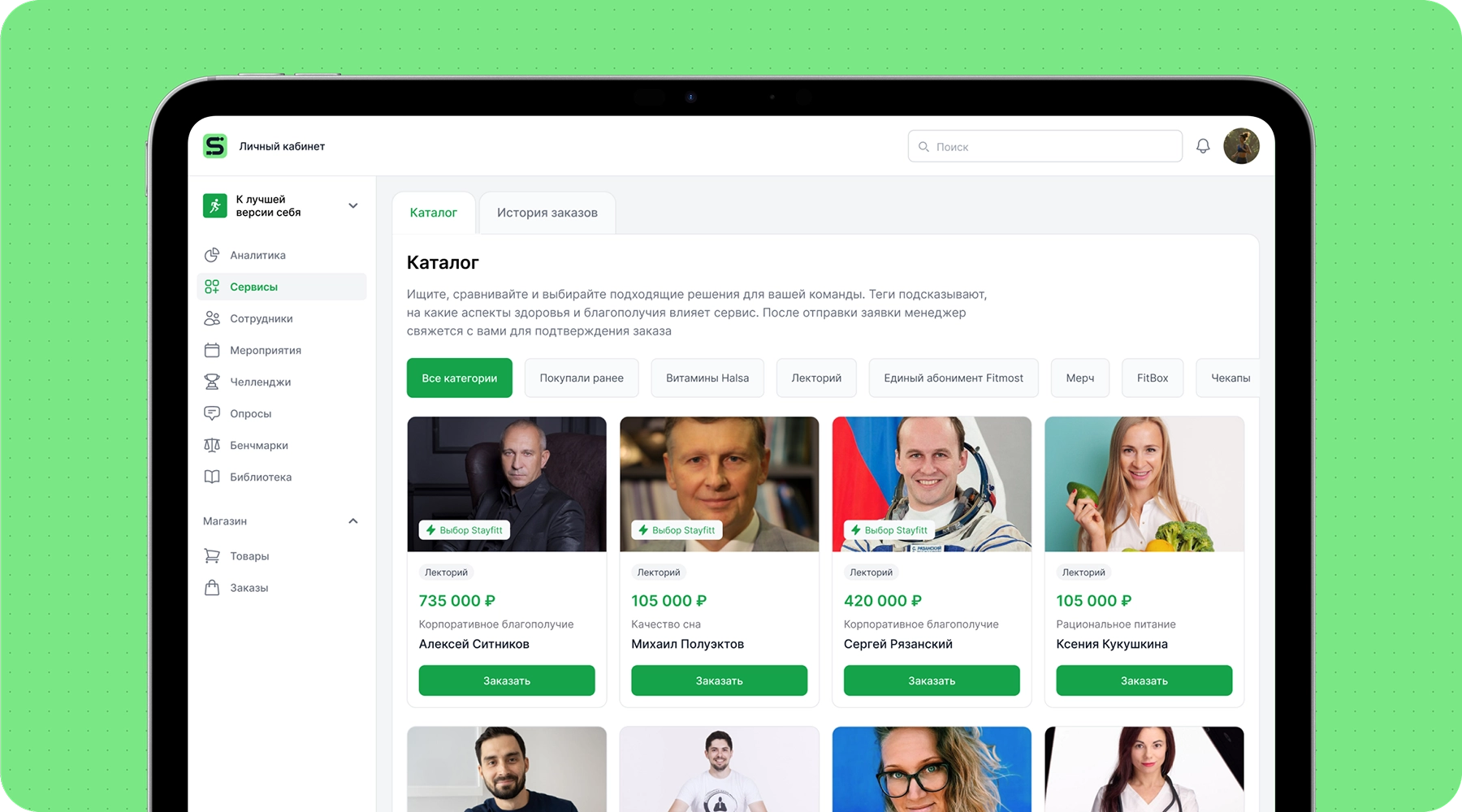 Выберите и закажите витамины, чекапы, фитнес-наборы, лекции, абонементы и другой корпоративный мерч