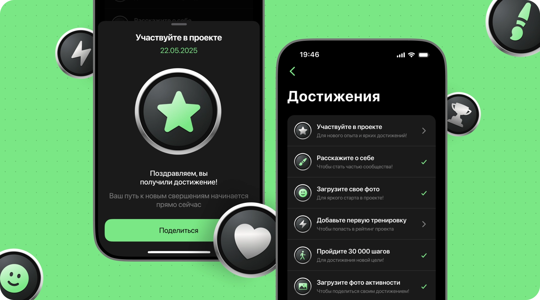 Виртуальные трофеи в студию! 🏆 Они помогут поддержать мотивацию и вдохновиться на новые свершения. На старте пользователь может открыть 12 достижений, но список достижений будет регулярно пополняться! Найти их можно в разделе Активность → Достижения